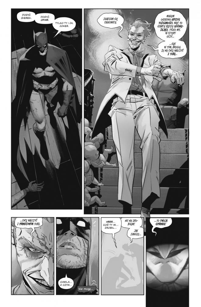 Do momentu wejścia do „domu dla lalek”, gdzie ma dojść do spotkania z powracającym Jokerem, wszystko układa się w spójną całość, strona po stronie skutecznie wzmacniającą napięcie i zainteresowanie. Jest odrobina grozy, szalonych pomysłów nemezis Batmana, jest nastrój, w którym coraz bardziej ma się ochotę rozgościć... i wtedy gaz wyzwala Zura ku masochistycznej uciesze zielonowłosego klauna. Niby pragnącego walki z najgroźniejszym obliczem swojego odwiecznego wroga, co jest argumentem naciąganym i pretekstowym.
